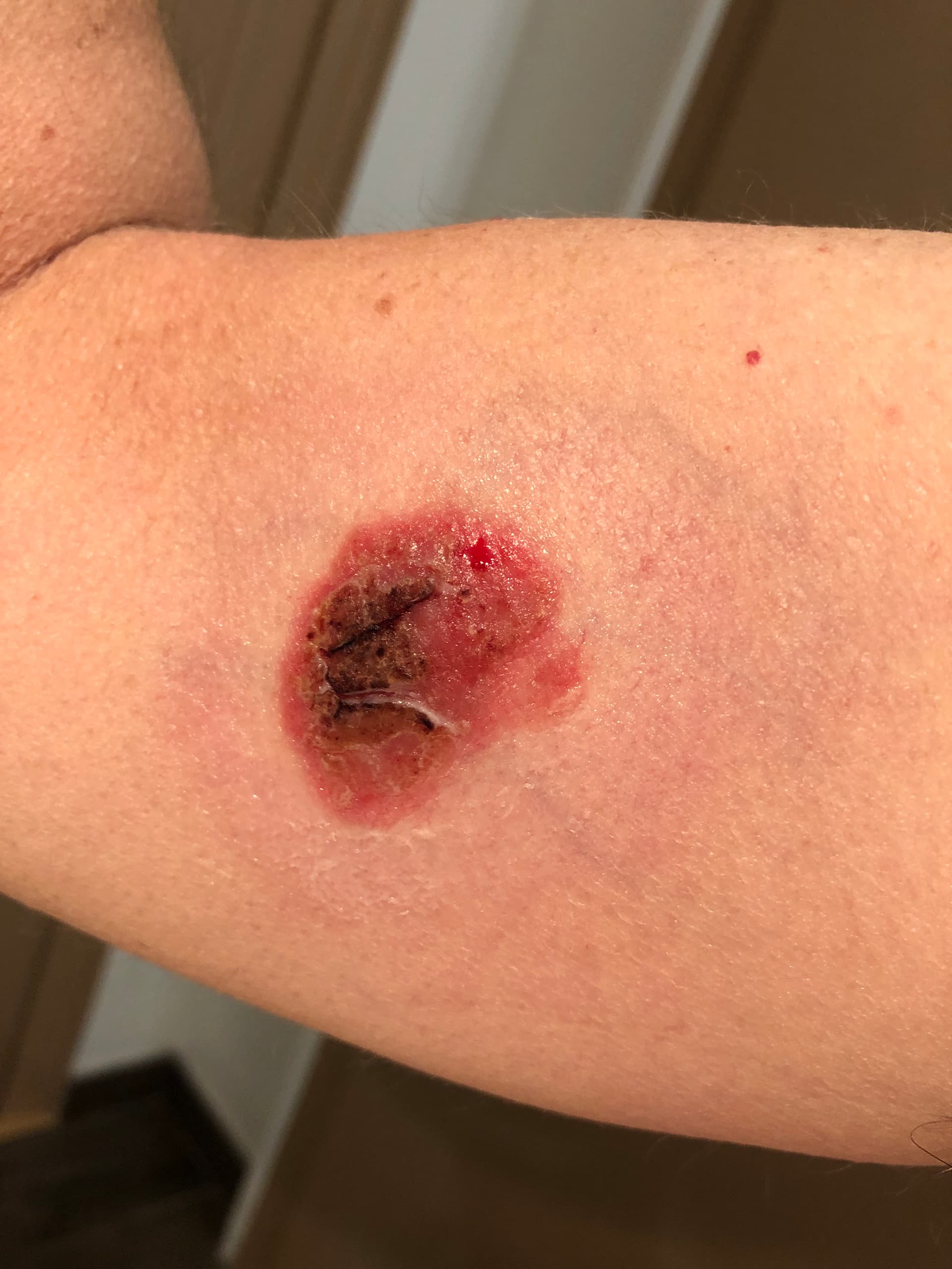 Ici les brulures dans mon dos ont laissé place a des plaques rouges. Je galere pour poser la pommade il va falloir que je demande de l’aide .