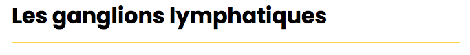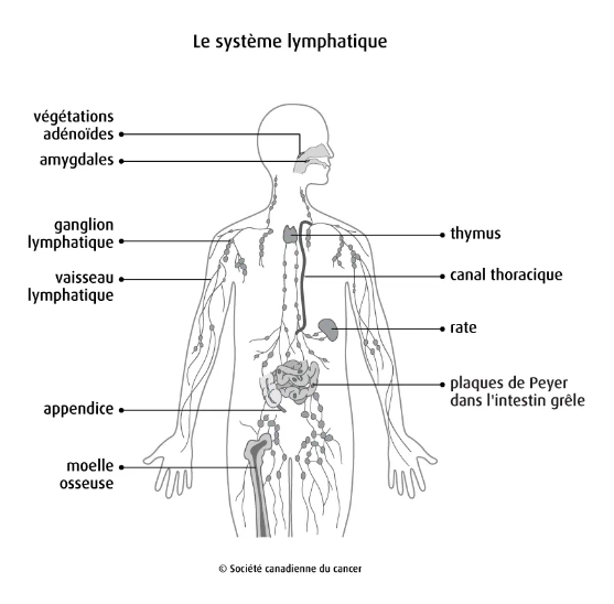 Les ganglions lymphatiques sont de petites masses de tissu lymphatique en forme de haricot qui longent les vaisseaux lymphatiques. Ils entreposent les lymphocytes et filtrent les déchets, bactéries et cellules endommagées, dont les cellules cancéreuses, de la lymphe. Les lymphocytes présents dans les ganglions lymphatiques attaquent les bactéries et les virus qu’ils trouvent dans la lymphe. C’est pourquoi les ganglions lymphatiques enflent souvent quand nous sommes malades ou quand nous combattons une maladie comme le rhume ou la grippe.
