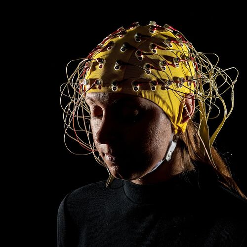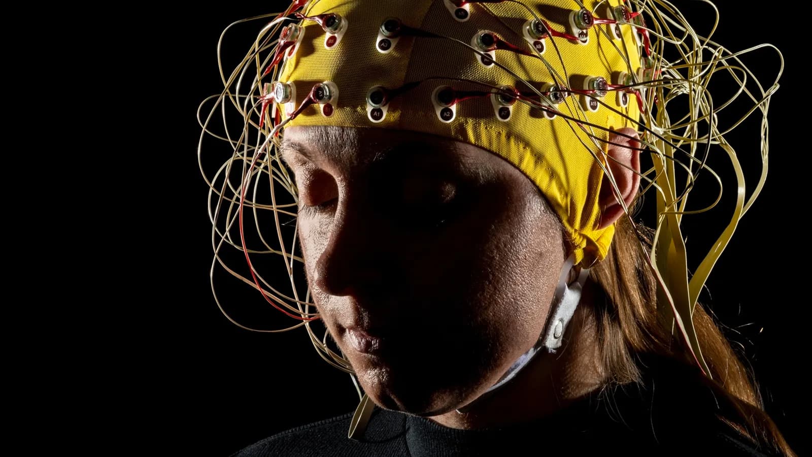 Un électroencéphalogramme mesure l’activité électrique du cerveau de cette volontaire à Alembic, un centre corps-esprit à Berkeley, en Californie. Les personnes qui méditent régulièrement présentent une activation plus importante dans leurs réseaux d’attention (les zones jaunes ci-dessous) que les personnes qui ne méditent pas.
