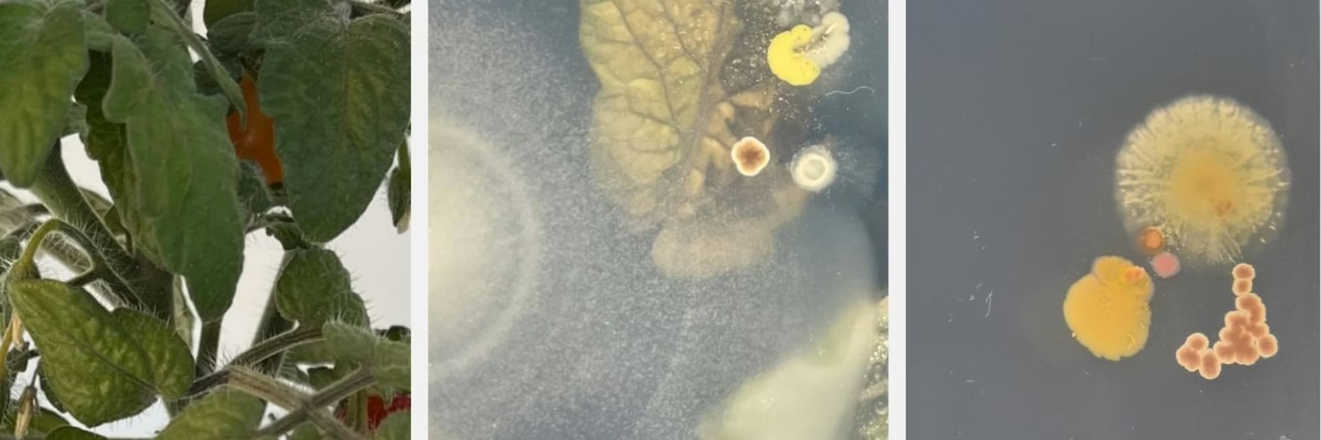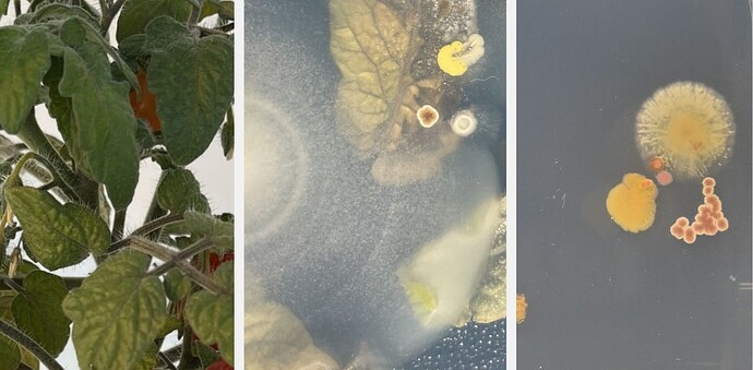 Plant de tomate, feuille de tomate avec du microbiote cultivable et empreinte de feuille sur boîte de Pétri.
