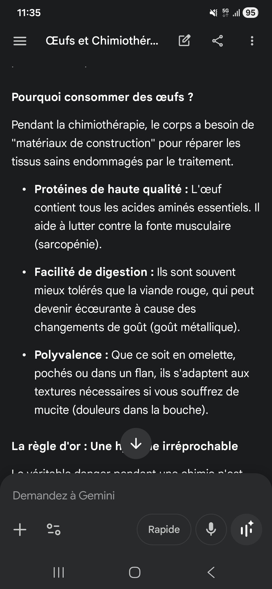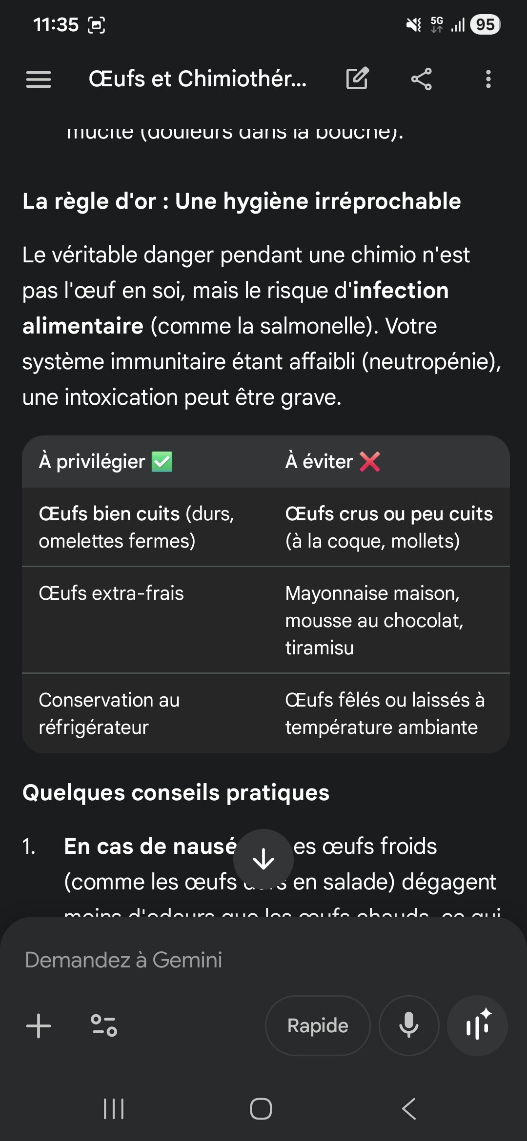 L’oeuf semble très bon en cas de chimiothérapie (dixit l’IA) mais il est préférable de le consommer bien cuit pour limiter les risques d’infections en cas de neutropenie ou de baisse de défenses immunitaires