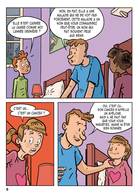 Au fil des pages, la famille répond aux questionnements de Léo et Léa suite à l’annonce du cancer de leur grand-mère.