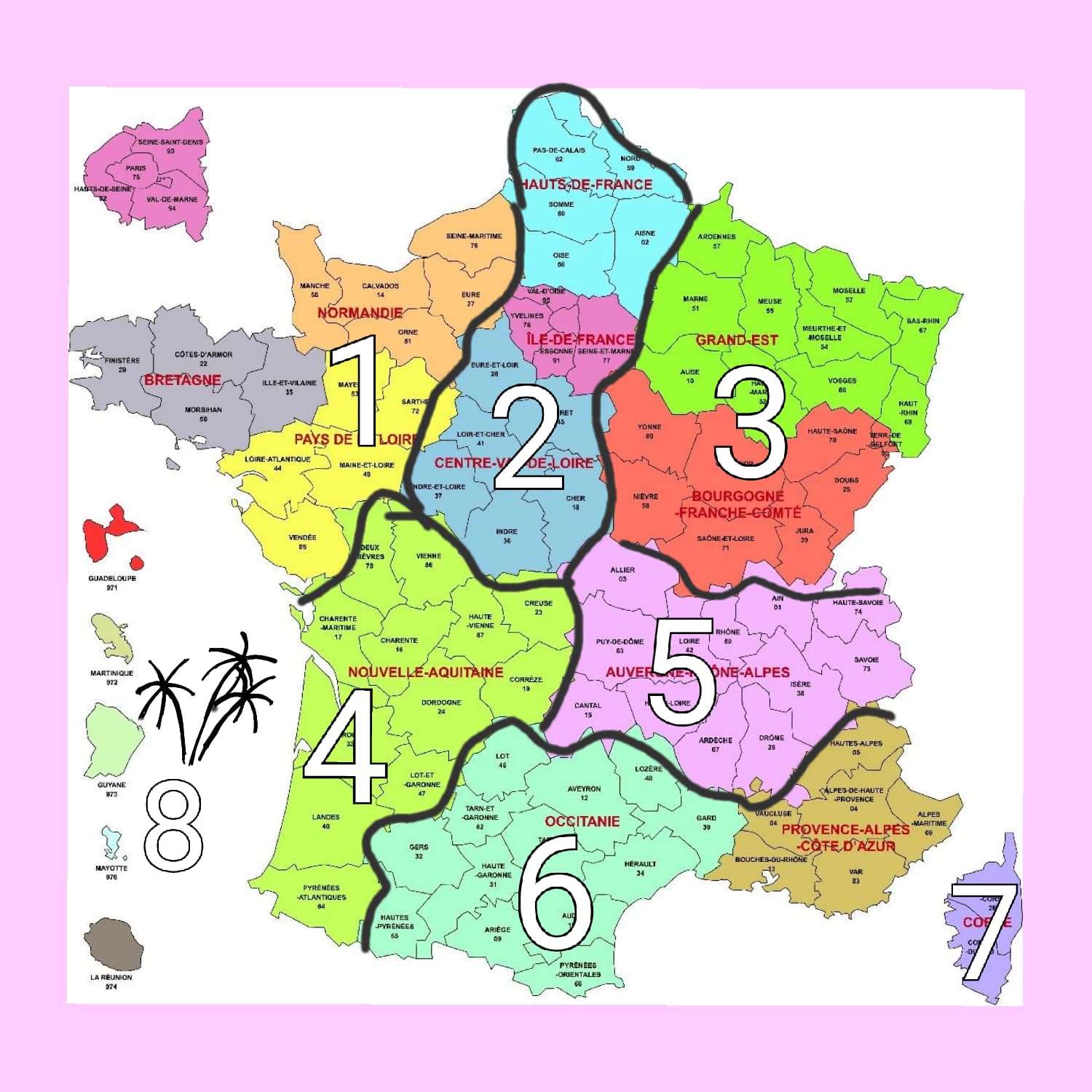 1, 2, 3, 4, 5, 6, 7 ,8 et la région selon la carte