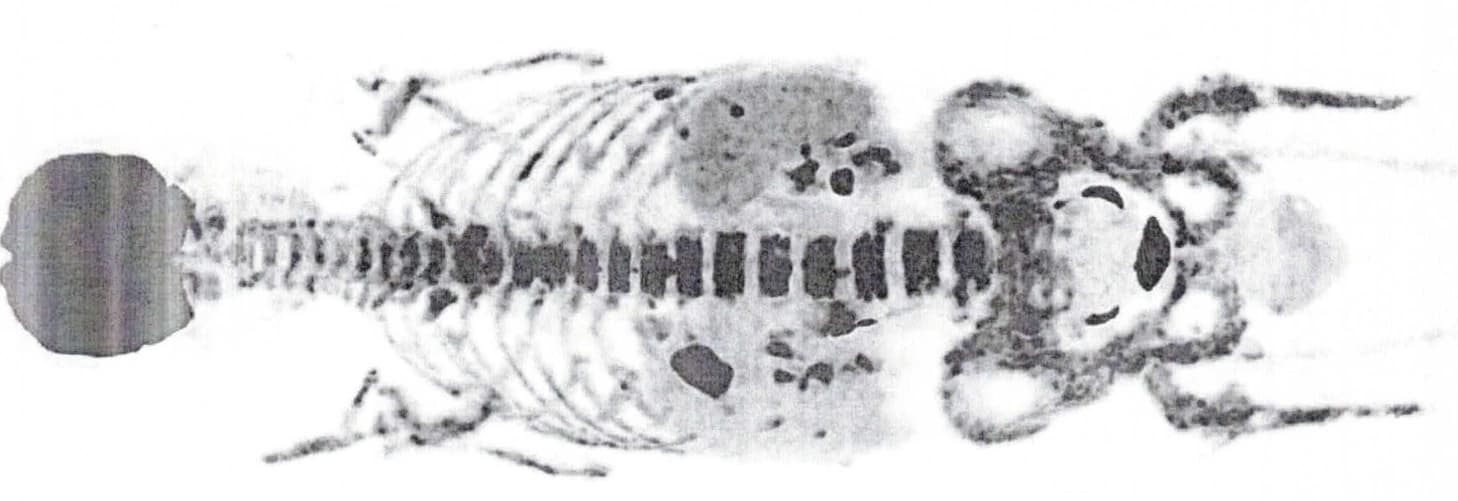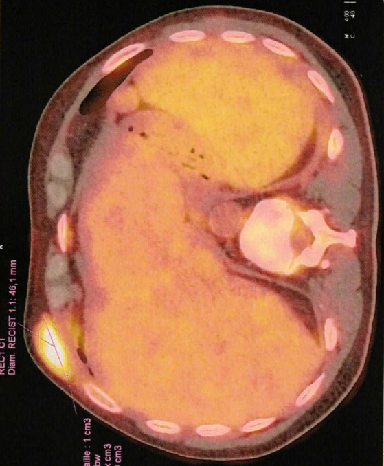 Plus c’est jaune, plus il y a de cellules cancéreuses qui se régalent en consommant le sucre radio-actif, on voit cette boule jaune au dessus de côtes, mais j’en avais une bonne dizaine à l’intérieur du corps. C’était la zone la plus hyper-métabolique de mon TEP Scan, une boule de 5 cm indolore qui avait poussé en quelques semaines. Mais on voit qu’il y en a aussi dans la rate et le foie …